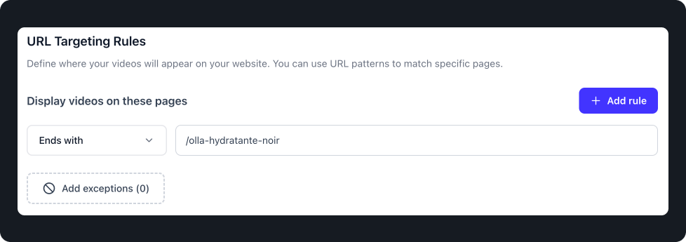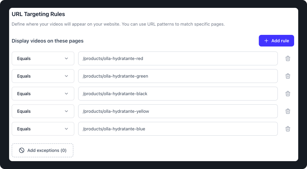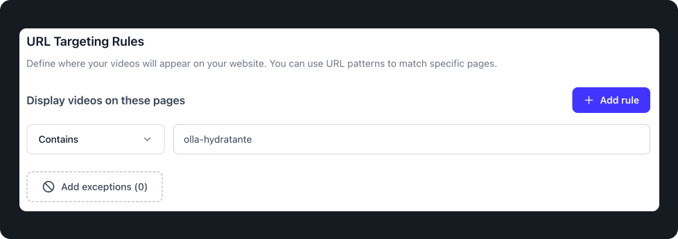 In this example, PlayShorts will play videos on all URLs containing olla-hydratante