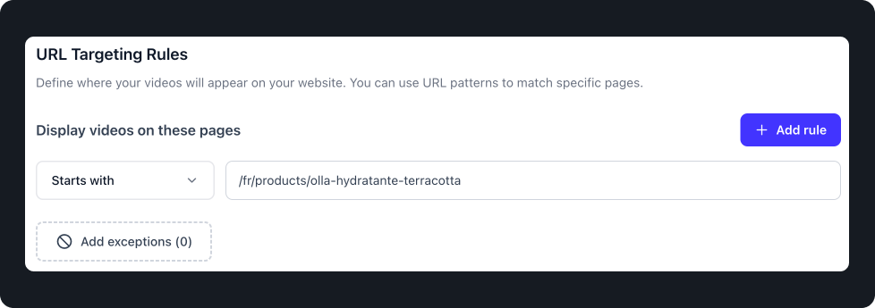 Here, the videos will be displayed on all product sheets where the URL begins with :