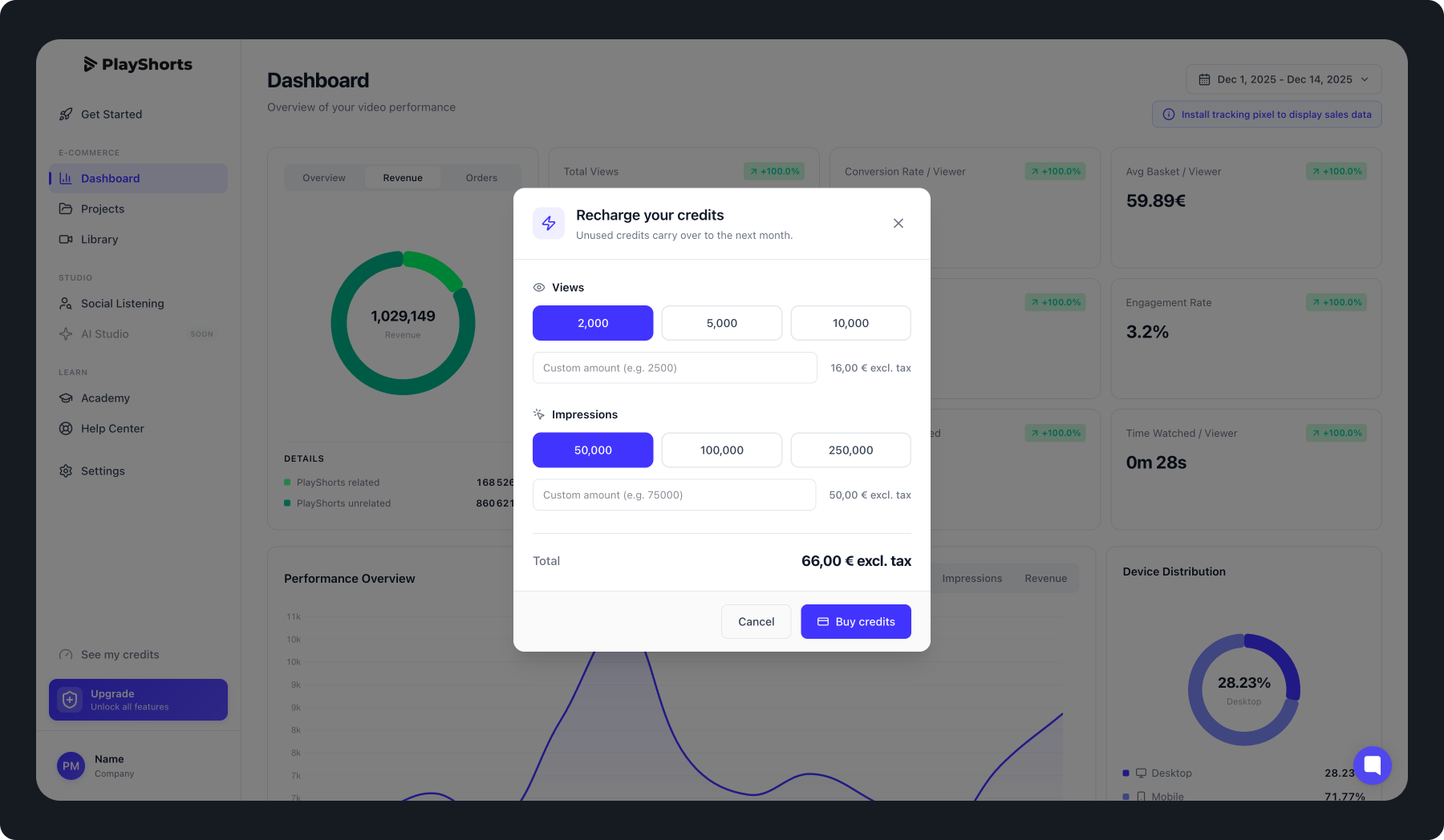 Indicate the quantity of view credits and/or impressions you wish to purchase.