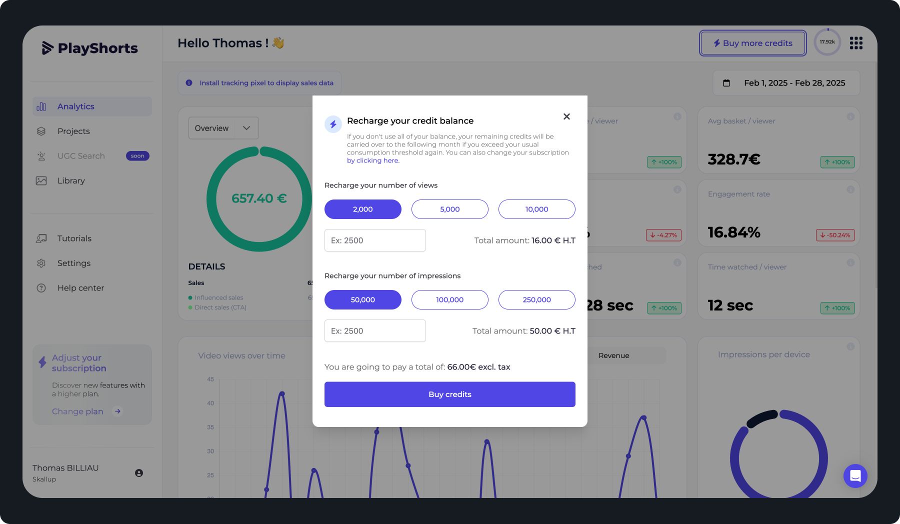 To do so, simply go to your dashboard and click on the “Top up credits” button.